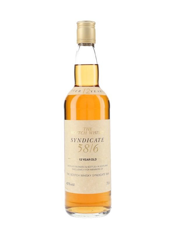 The back label reads: In 1958 a very rare blend of High Quality Scotch Malt and Grain Whiskies was discovered in a warehouse in Leith, Edinburgh. To ensure the continuance of the blend a group of six friends formed a syndicate, hence the name SYNDICATE 58/6. SYNDICATE 58/6 is today produced to the same high standard as that original blend'.