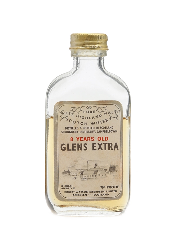 A miniature bottle of Glens Extra 8 Year Old Scotch whisky which was distilled at Springbank in, we estimate, the 1960s.