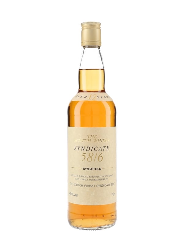 The back label reads: In 1958 a very rare blend of High Quality Scotch Malt and Grain Whiskies was discovered in a warehouse in Leith, Edinburgh. To ensure the continuance of the blend a group of six friends formed a syndicate, hence the name SYNDICATE 58/6. SYNDICATE 58/6 is today produced to the same high standard as that original blend'.