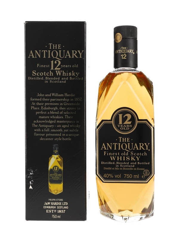 A bottle of The Antiquary 12 Year Old Finest Old Scotch Whisky, produced by J & W Hardie Ltd. We estimate this was bottled in the 1980s.