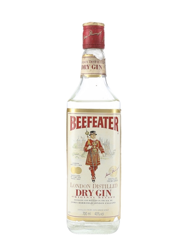 A bottle of Beefeater London Dry Gin, produced by James Burrough Ltd. London, England. We estimate this was bottled in the 1990s.