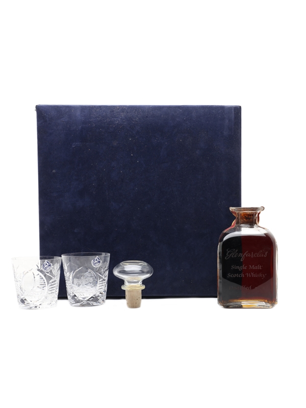 A bottle of Glenfarclas 1955 Single Malt Scotch Whisky presented in a glass decanter with a stopper. This bottle comes with six branded Glencairn crystal whisky tumblers in a presentation box. We estimate this was bottled in the 1980s.