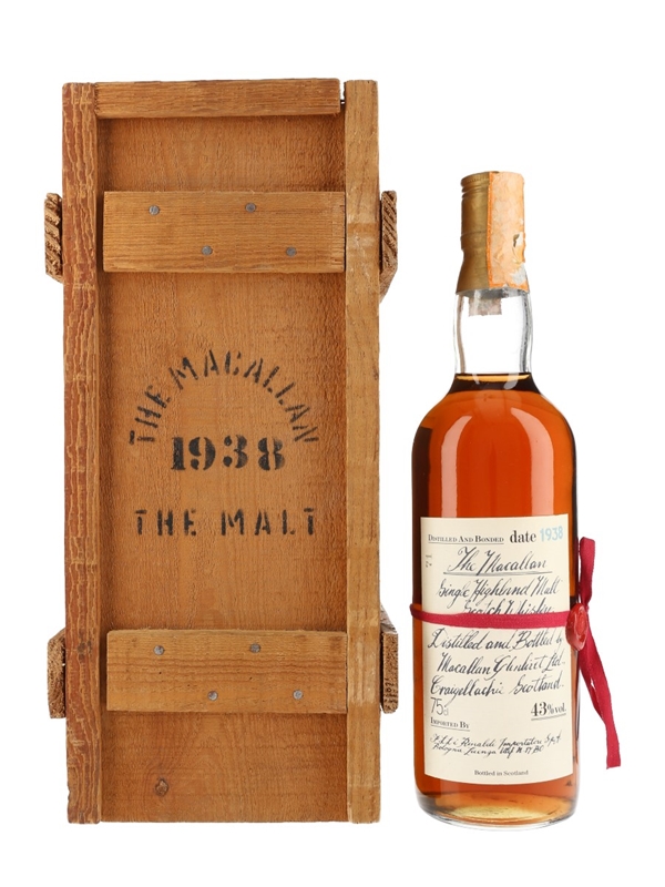 A bottle of The Macallan 1938 Single Highland Malt Scotch Whisky. This was bottled for the Italian market and imported by Rinaldi, we estimate in the 1980s. This bottle has a handwritten label.