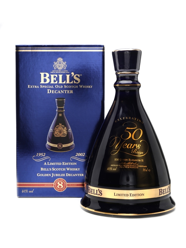 A blue ceramic decanter from Wade containing Bell's eight-year-old blended Scotch whisky, which was released to celebrate the golden jubilee of Queen Elizabeth II in 2002.