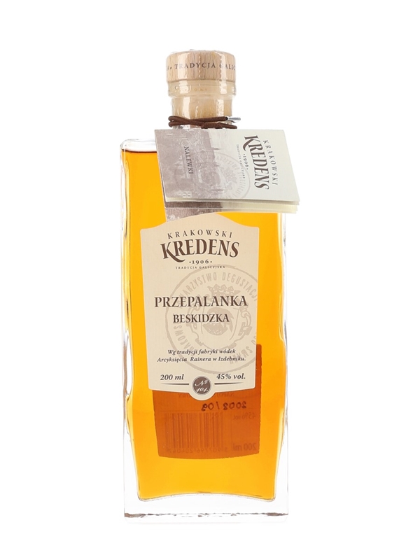 A 20cl bottle of Krakowski Kredens Przepalanka Beskidzka, a smoked vodka produced in Poland.