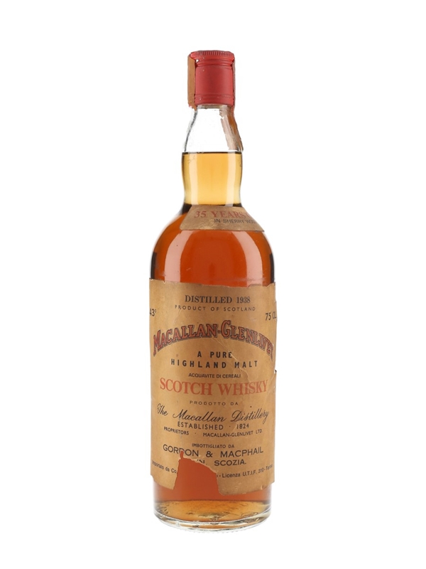 A bottle of The Macallan-Glenlivet 35 Year Old Pure Highland Malt Scotch Whisky. This was distilled in 1938, matured in sherry casks and bottled by Gordon & MacPhail. This was bottled for the Italian market and imported by Pinerolo, we estimate in the 1970s.