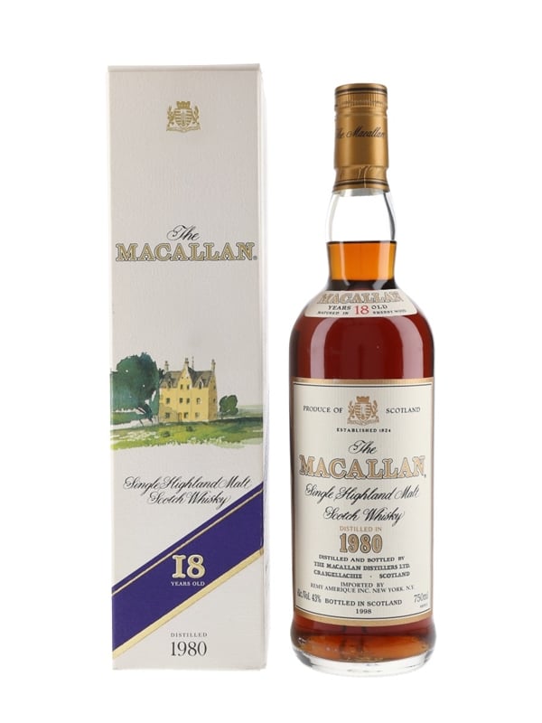 A bottle of The Macallan 18 Year Old Single Malt Scotch Whisky. This was distilled in 1980, matured in sherry oak casks and bottled in 1998. This was bottled for the US market and imported by Rémy Amerique.