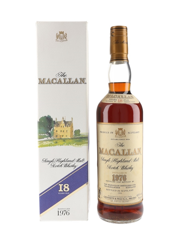 A bottle of The Macallan 18 Year Old Single Highland Malt Scotch Whisky. This was distilled in 1976, matured in sherry casks and bottled in 1994 for Italian importer Giovinetti & Figli. This was imported to Japan by Three Rivers.