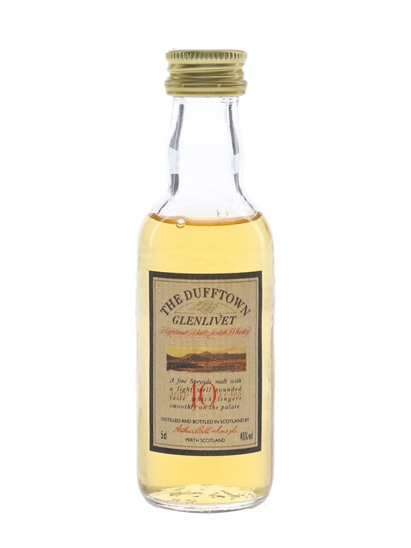 A miniature bottle of The Dufftown Glenlivet 10 Year Old Highland Malt Scotch Whisky, produced by Arthur Bell & Sons. We estimate this was bottled in the 1980s to 1990s.