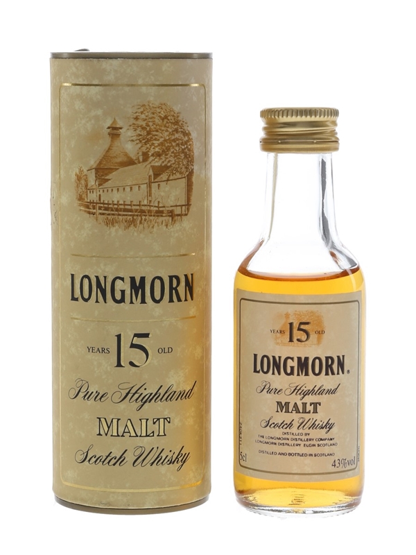 A miniature bottle of Longmorn 15 Year Old Pure Highland Malt Scotch Whisky. We estimate this was bottled in the 1980s.