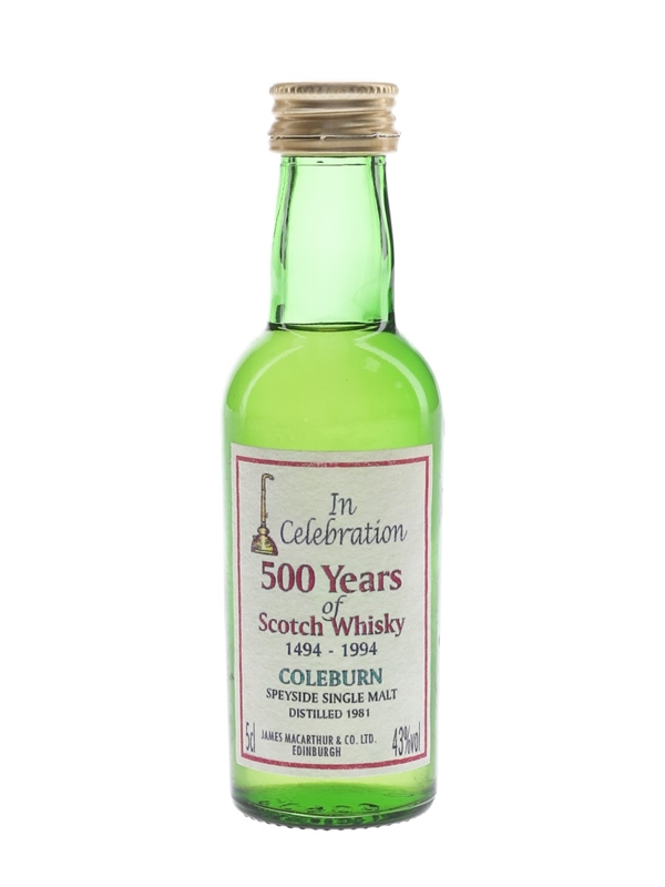 A miniature bottle of Coleburn Speyside Single Malt, distilled in 1981 and bottled by James MacArthur's to commemorate the 500 years of Scotch whisky in 1994.