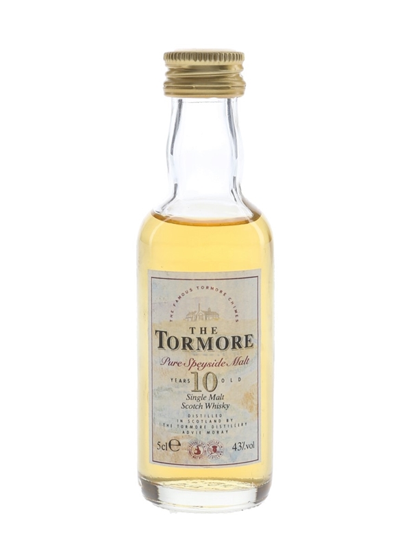 A miniature bottle of The Tormore 10 Year Old Pure Speyside Single Malt Scotch Whisky. We estimate this was bottled in the 1990s.