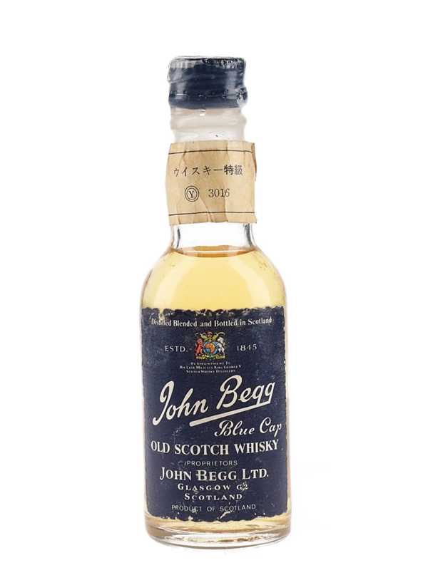 A miniature bottle of John Begg Blue Cap Old Scotch Whisky. This was distilled, blended and bottled in Scotland by John Begg Ltd Distillers, Royal Lochnagar Distillery, Balmoral. This was imported to Japan, we estimate in the 1970s.