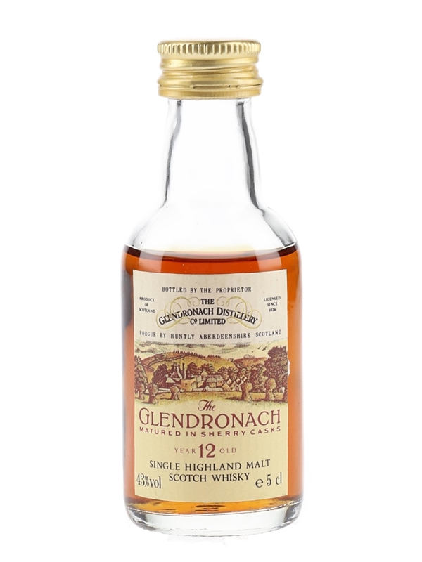 A miniature bottle of The Glendronach 12 Year Old Pure Highland Malt Scotch Whisky, matured in sherry casks. We estimate this was bottled in the 1980s to 1990s.