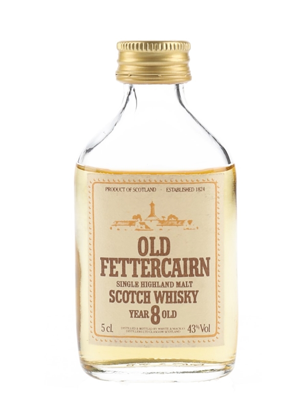 A miniature bottle of Old Fettercairn 8 Year Old Single Highland Malt Scotch Whisky, distilled and bottled by White & Mackay Distillers Ltd. We estimate this was bottled in the 1980s.