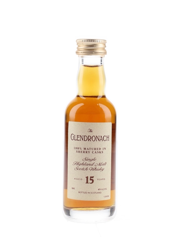 A miniature bottle of The Glendronach 15 Year Old Single Malt Scotch Whisky matured in sherry casks. This was imported to the US by Hiram Walker. We estimate this was bottled in the 1990s.