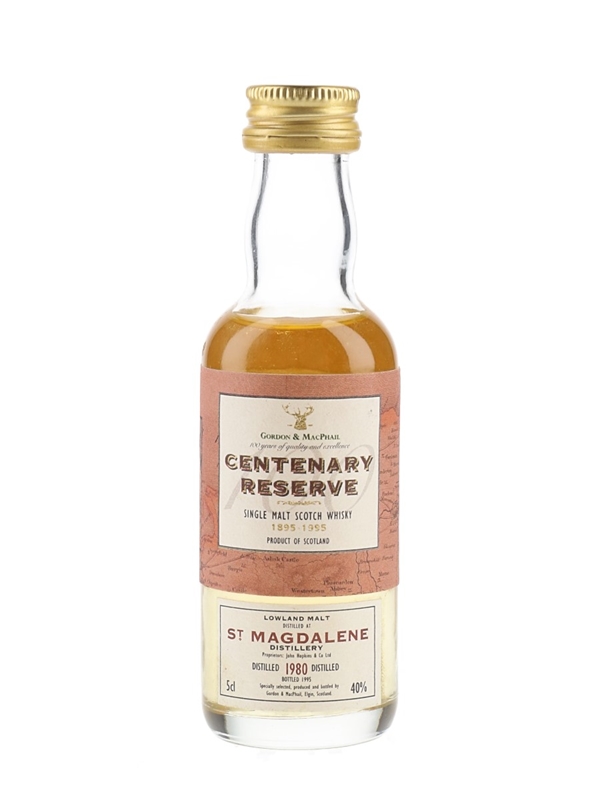 A miniature bottle of St. Magdalene Lowland Single Malt Scotch Whisky. This was distilled in 1980 and bottled in 1995 by Gordon & MacPhail as part of the Centenary Reserve series.