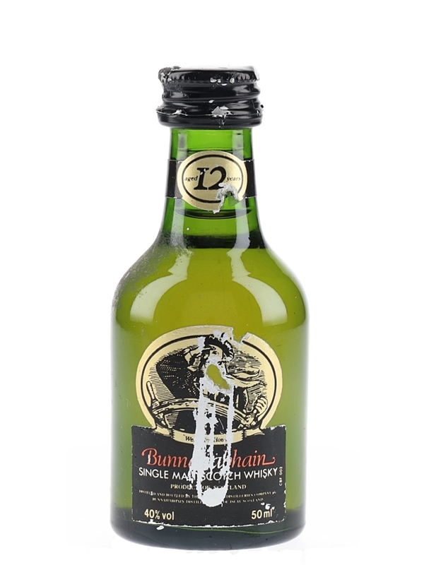 A miniature bottle of Bunnahabhain 12 Year Old Single Malt Scotch Whisky. We estimate this was bottled in the 1980s to 1990s.