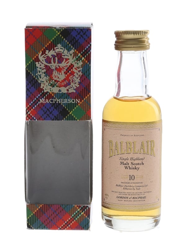 A miniature bottle of Balblair 10 Year Old Single Highland Malt Scotch Whisky, bottled by Gordon & MacPhail. The bottling code indicates this was bottled in the 1990s.