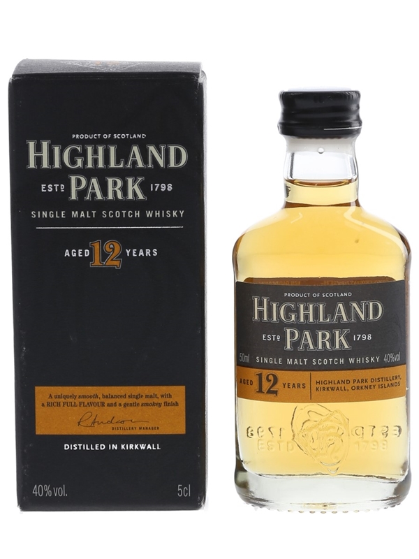 A miniature bottle of Highland Park 12 Year Old Single Malt Scotch Whisky. This was bottled prior to 2012 when Russell Anderson was the distillery manager.