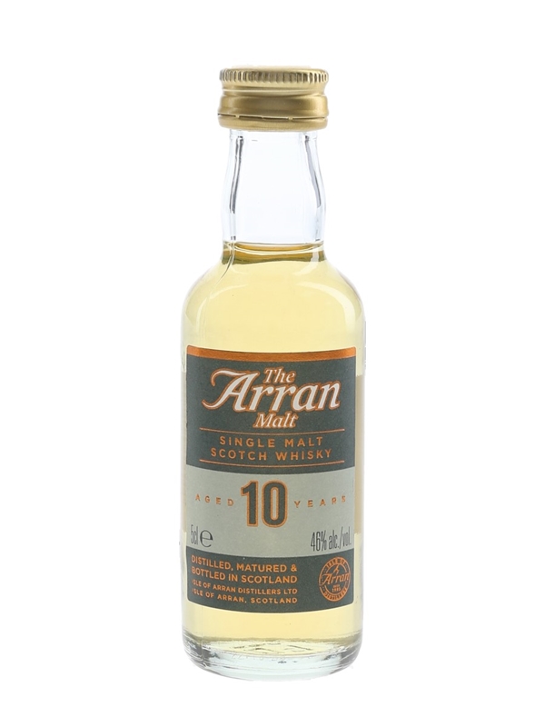 A miniature bottle of The Arran Malt 10 Year Old, bottled at 46% ABV.