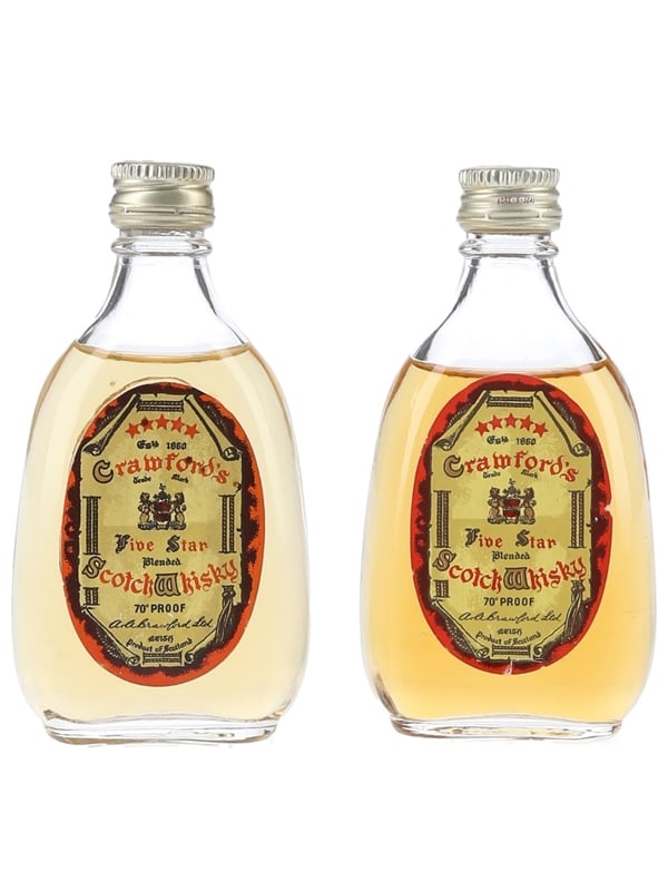 This lot contains two miniature bottles of Crawford's Five Star Blended Scotch Whisky. We estimate these were bottled in the 1970s.