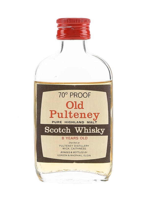 A miniature bottle of Old Pulteney 8 Year Old Pure Highland Malt Scotch Whisky, bottled by Gordon & MacPhail. We estimate this was bottled in the 1970s.