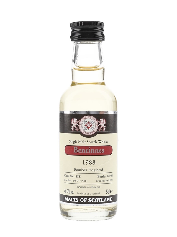 A miniature bottle of Benrinnes 1988 Single Malt Scotch Whisky. This was distilled on 10 March 1988, matured in a bourbon hogshead and bottled in August 2009 by independent bottler Malts of Scotland.