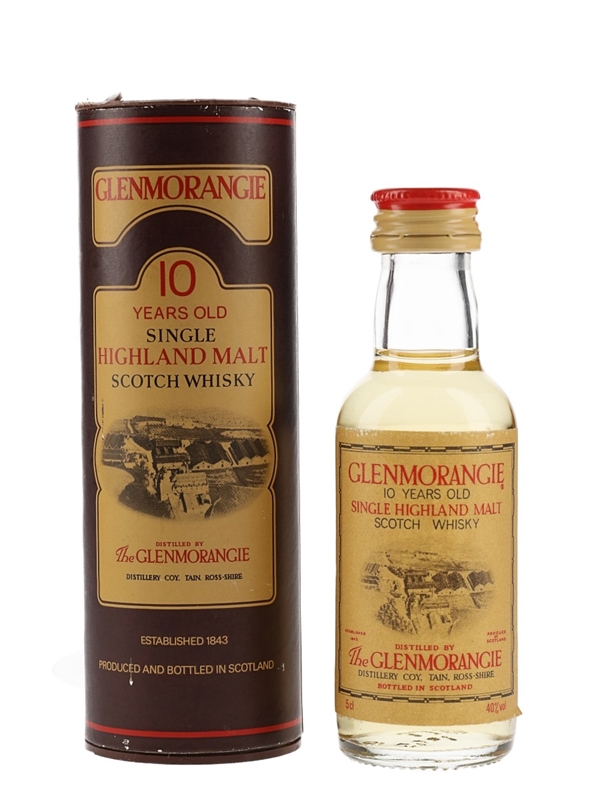 A miniature bottle of Glenmorangie 10 Year Old Single Highland Malt Scotch Whisky. We estimate this was bottled in the 1980s.