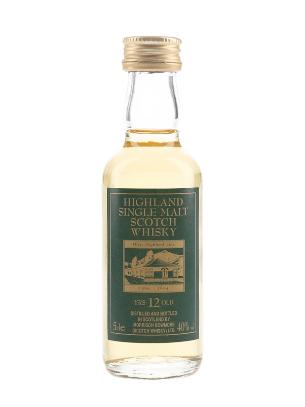 A miniature bottle of West Highland Line 12 Year Old Single Malt Scotch Whisky, distilled and bottled by Morrison Bowmore Ltd.