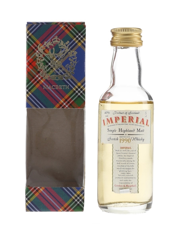 A miniature bottle of Imperial 1990 Single Highland Malt Scotch Whisky, bottled by Gordon & MacPhail. The bottling code indicates this was bottled in 2001.