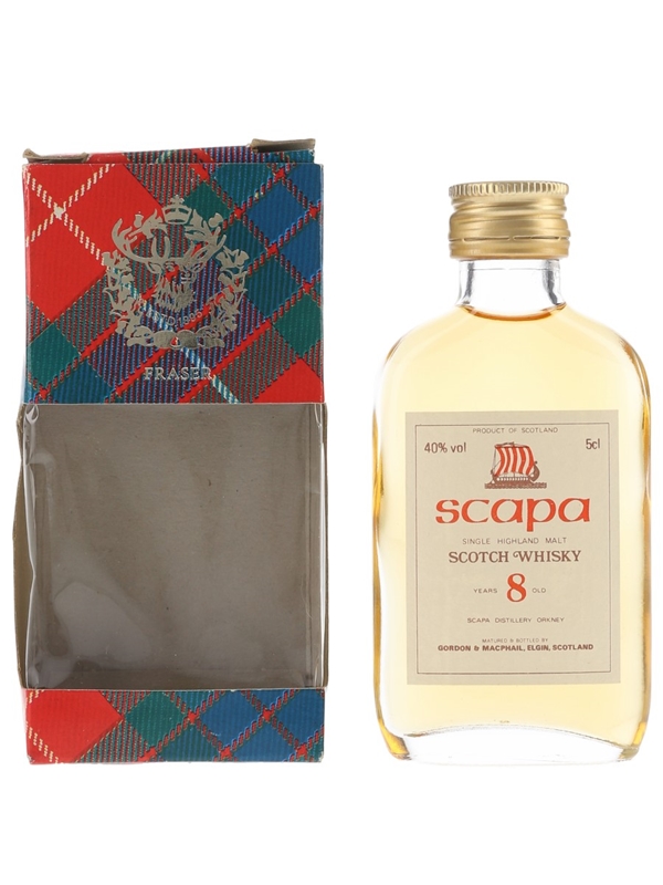 A miniature bottle of Scapa 8 Year Old Single Malt Scotch Whisky, bottled by Gordon & MacPhail. We estimate this was bottled in the 1980s.