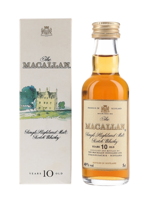 A miniature bottle of The Macallan 10 Year Old Single Highland Malt Scotch Whisky, matured in sherry wood. We estimate this was bottled in the 1990s.