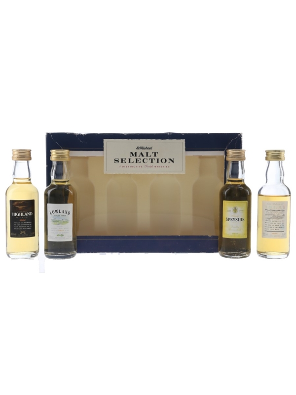 The St Michael Malt Selection Set for Marks & Spencer, contains four miniature bottles of single malt Scotch whisky from the four regions of Scotland.