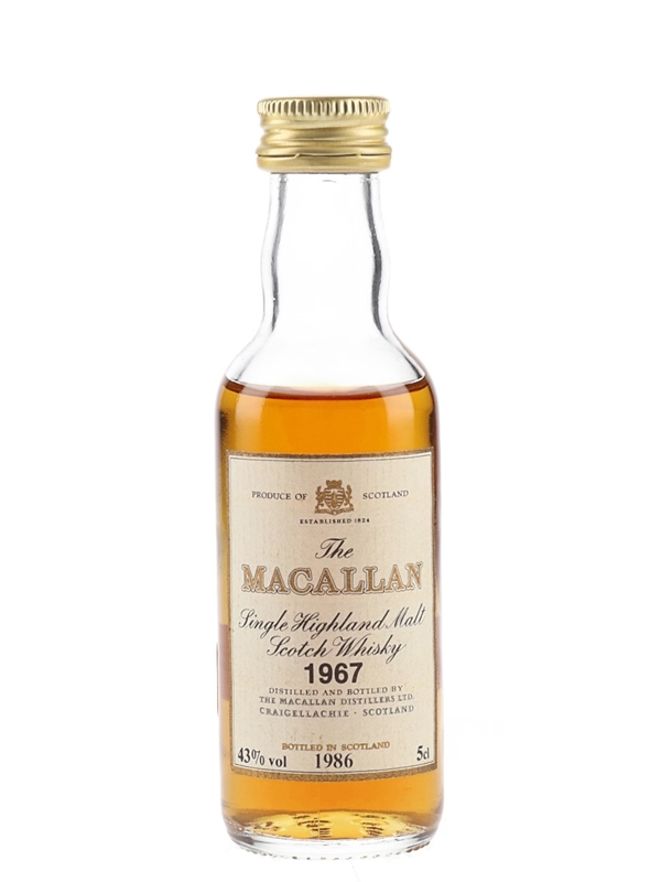 A miniature bottle of The Macallan 1967 Single Highland Malt Scotch Whisky. This was distilled in 1967 and bottled in 1986 at 43% ABV. This was bottled for the French market and imported by Corade, Paris.