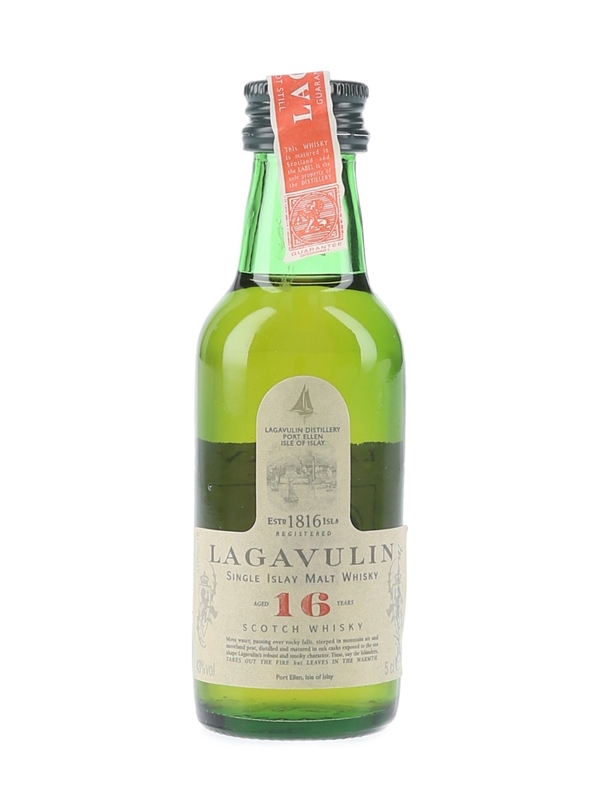 A miniature bottle of Lagavulin 16 Year Old Single Islay Malt Scotch Whisky.