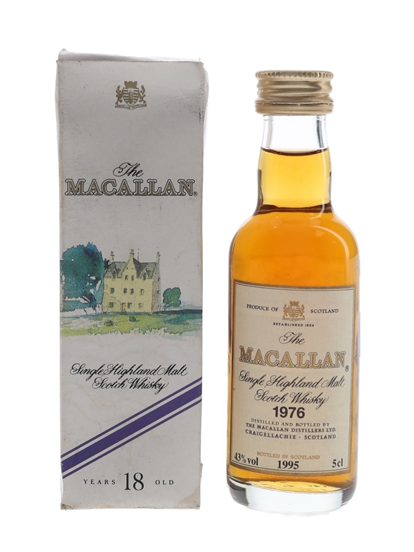 A miniature bottle of The Macallan 1976 Single Highland Malt Scotch Whisky. This was distilled in 1976 and bottled in 1995 at 43% ABV.