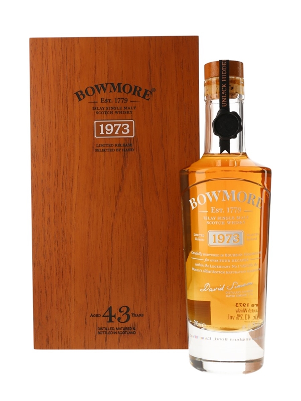A limited edition bottle of Bowmore 43 Year Old Islay Single Malt Scotch Whisky. This was distilled on 10 May 1973 and bottled from six hand-selected bourbon hogsheads maturing in the No.1 Vaults. This was bottled on 2 June 2016 at 43.2% ABV. The bottle is presented in a wooden case and comes in the original outer cardboard box.