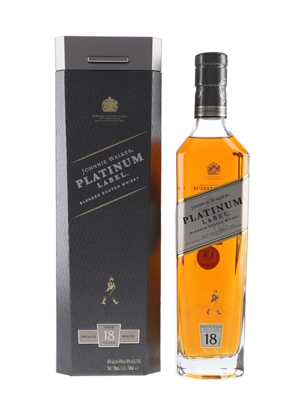 A bottle of Johnnie Walker Platinum Label 18 Year Old Blended Scotch Whisky in a presentation box.
