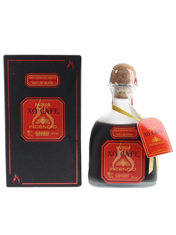 A bottle of Patrón XO Café Incendio, a liqueur made with Patrón Silver Tequila, Criollo chocolate and arbol chilli peppers from Mexico.