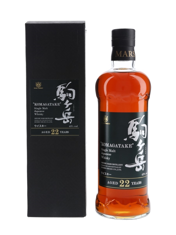 A bottle of Mars Komagatake 22 Year Old Single Malt Japanese Whisky, distilled at Shinshu Mars distillery and bottled by Hombo Shuzo Co. Ltd.