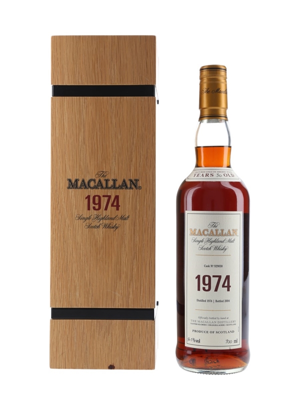 A bottle of The Macallan 1974 Single Highland Malt Scotch Whisky from the Fine & Rare collection. This was matured in sherry wood for 30 years and bottled in 2004.