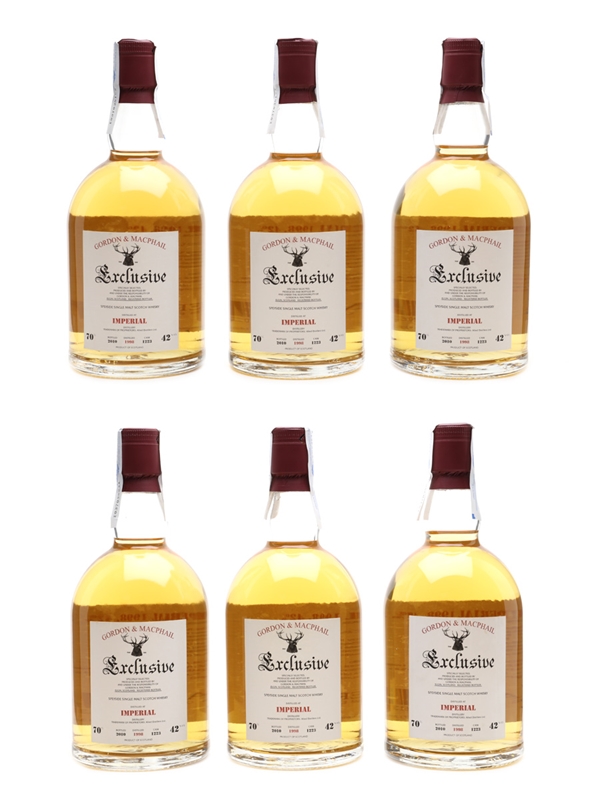 This lot contains six bottles of Imperial 1998 Single Malt Scotch Whisky. These were distilled on 9 September 1998, matured in a refill sherry hogshead and bottled on 14 June 2010 by Gordon & MacPhail as part of the Exclusive collection.