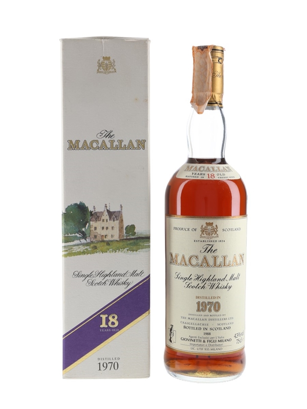 A bottle of The Macallan 18 Year Old Single Highland Malt Scotch Whisky. This was distilled in 1970, matured in sherry casks and bottled in 1988. This was bottled for the Italian market and imported by Giovinetti.