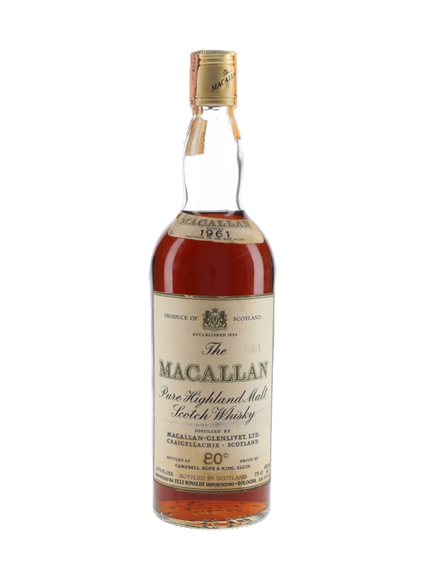 A bottle of The Macallan 1961 Pure Highland Malt Scotch Whisky, bottled by Campbell, Hope & King, we estimate in the late 1970s. This was imported to the Italian market by Rinaldi.