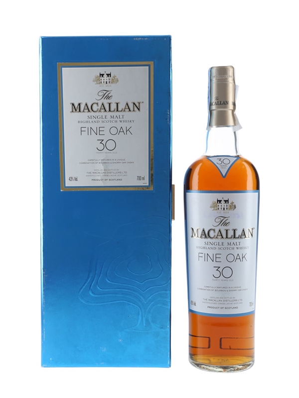 An old presentation bottle of The Macallan 30 Year Old Fine Oak Single Highland Malt Scotch Whisky, matured in a combination of bourbon and sherry casks.