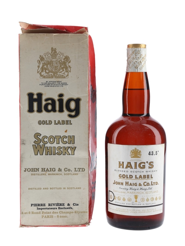 A bottle of Haig's Gold Label Blended Scotch Whisky, sealed with a spring-cap closure. This was bottled for French importer Pierre Riviere & Cie., we estimate in the 1960s.