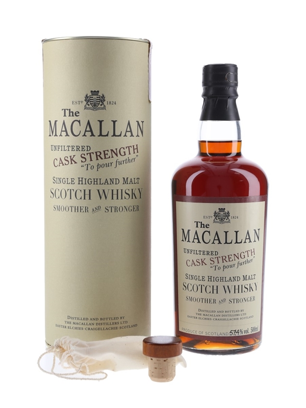 A bottle of Macallan Cask Strength 1990 Single Highland Malt Scotch Whisky. This was distilled on 27 December 1990, matured in a single sherry butt and bottled on 22 January 2003.