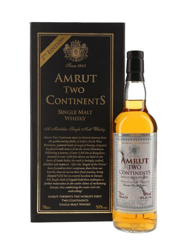 The 2nd edition of Amrut Two Continents Single Malt Whisky produced from India. This was matured first in India before spending its final three years of maturation in Europe. This was bottled in July 2011.