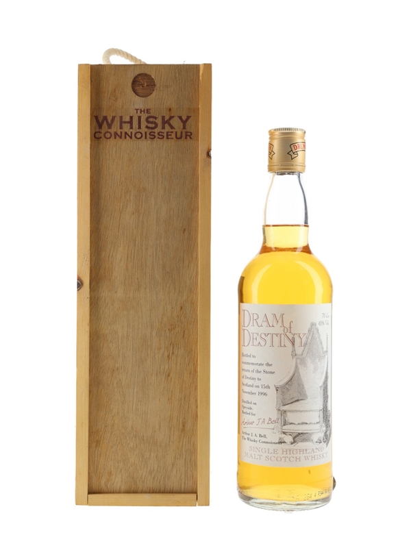 A bottle of Drumguish Single Malt Scotch Whisky. This was bottled to commemorate the return of the Stone of Destiny to Scotland on 15 November 1999. This was bottled for Arthur J A Bell by The Whisky Connoisseur.